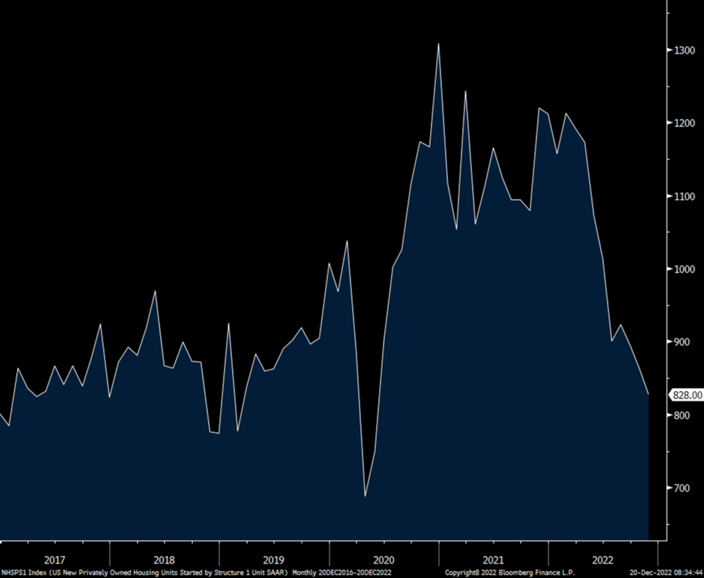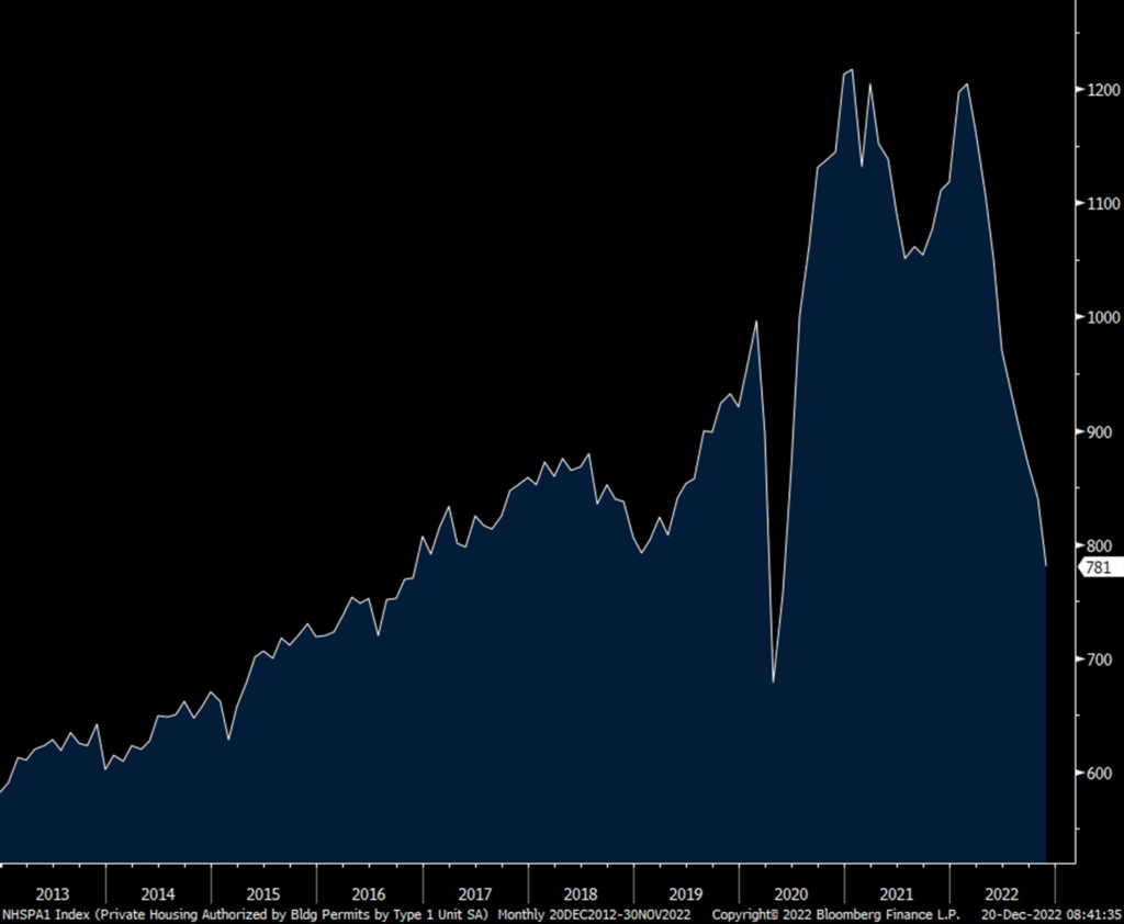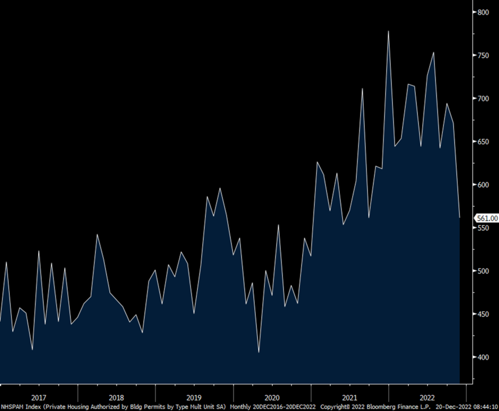 November housing starts totaled 1.427mm, just above the estimate of 1.40mm but down slightly from the 1.434mm seen in October (revised up from 1.425mm). The mix again is what we need to focus on as single family starts fell by 33k m/o/m to 828k, the lowest since May 2020. Multi family remains where the building strength is (for now, see permit figure below) as supply continues to catch up with demand. Multi family starts rose to 599k from 571k and that is the most since April.